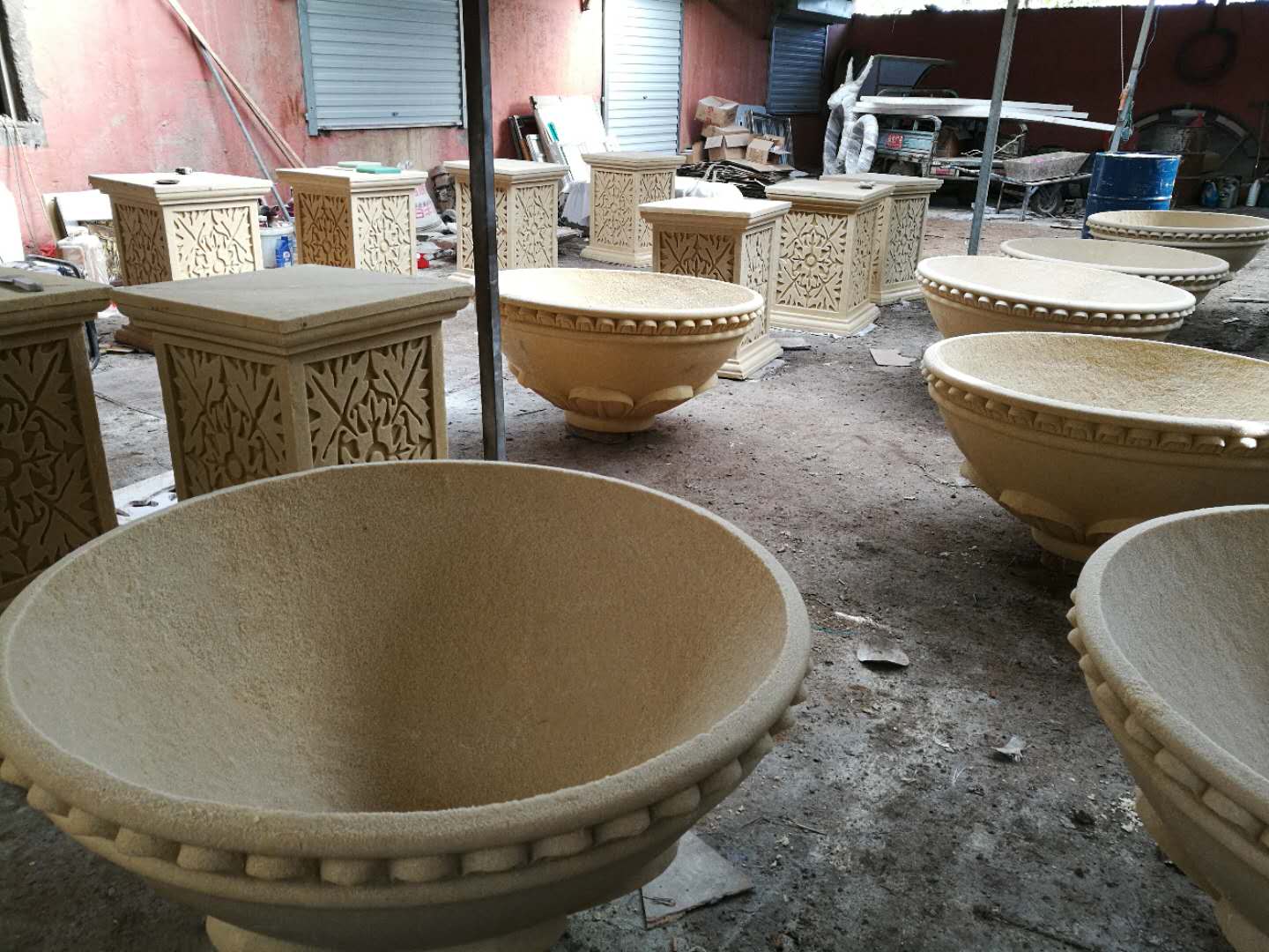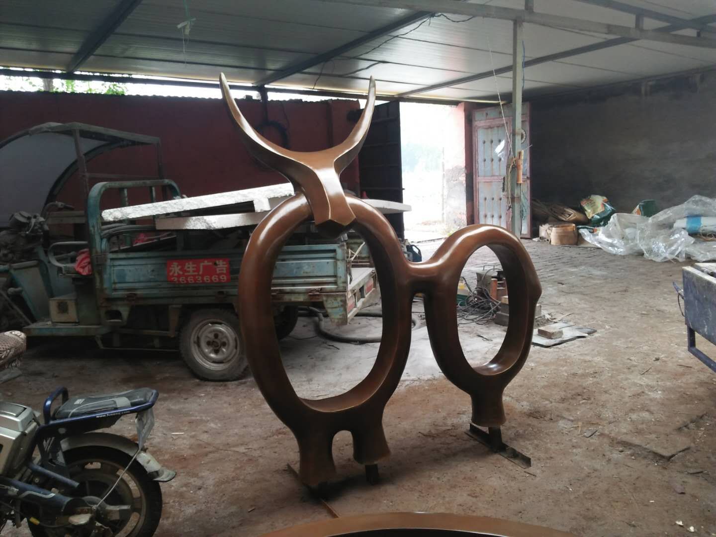 施工內(nèi)容:玻璃鋼牛雕塑、騎車人——不銹鋼雕塑、砂巖花缽雕塑。